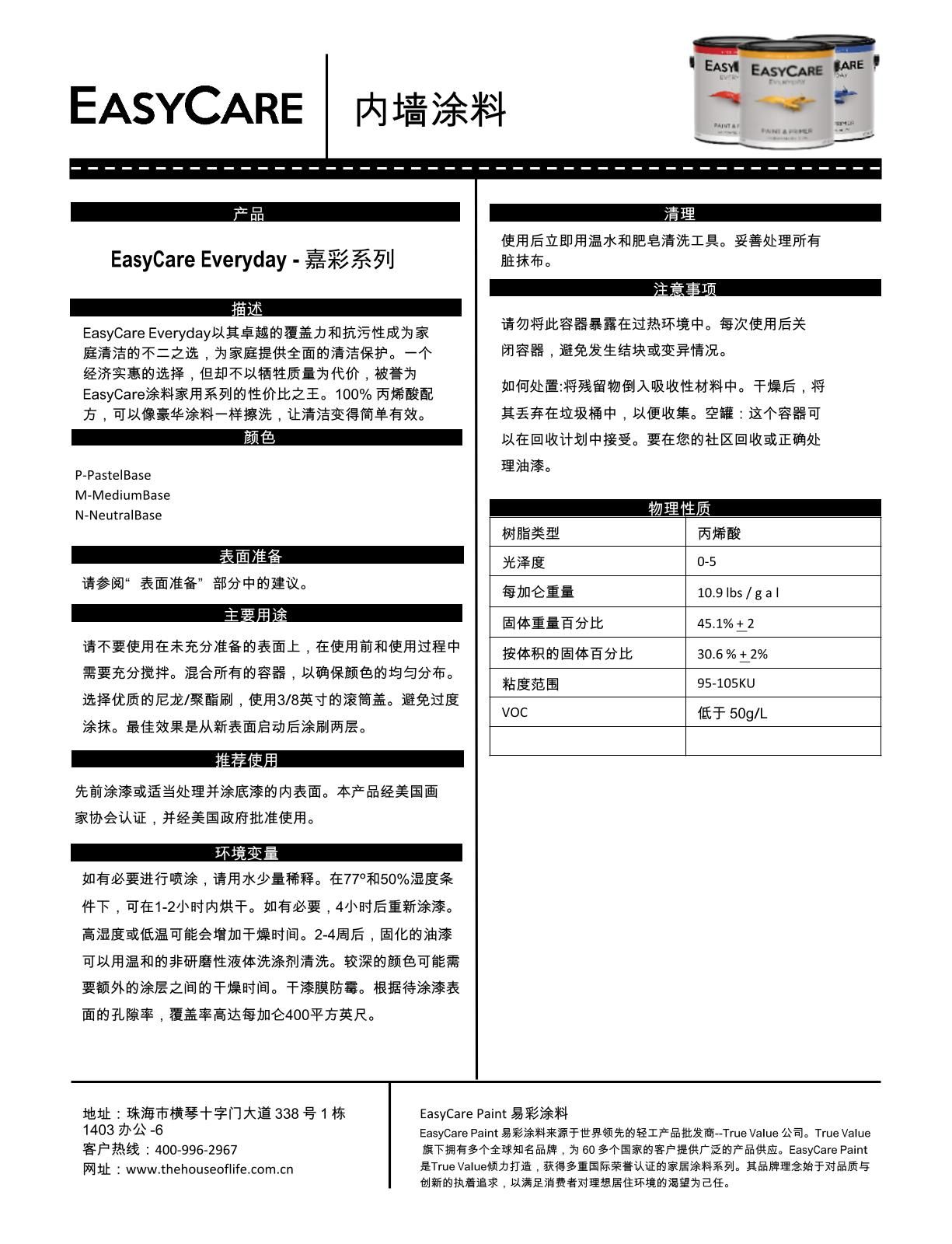 日常清洁不再烦恼!EasyCare Everyday以其卓越的覆盖力和抗污性成为家庭清洁的不二之选,为家庭提供全面的清洁保护。一个经济实惠的选择,但却不以牺牲质量为代价,被誉为EasyCare涂料家用系列的性价比之王。100% 丙烯酸配方,可以像豪华涂料一样擦洗,让清洁变得简单有效。全面适用于各种室内空间,多种光泽度选择,让粉刷室内空间变得轻松自在。